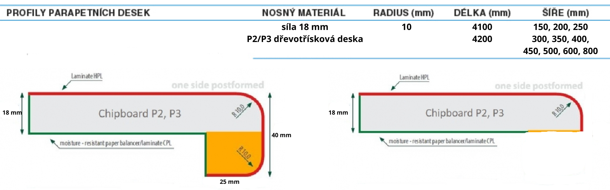 DTD parapety jsou vyráběny z dřevotřísky kvalitativní řady P2 nebo P3.